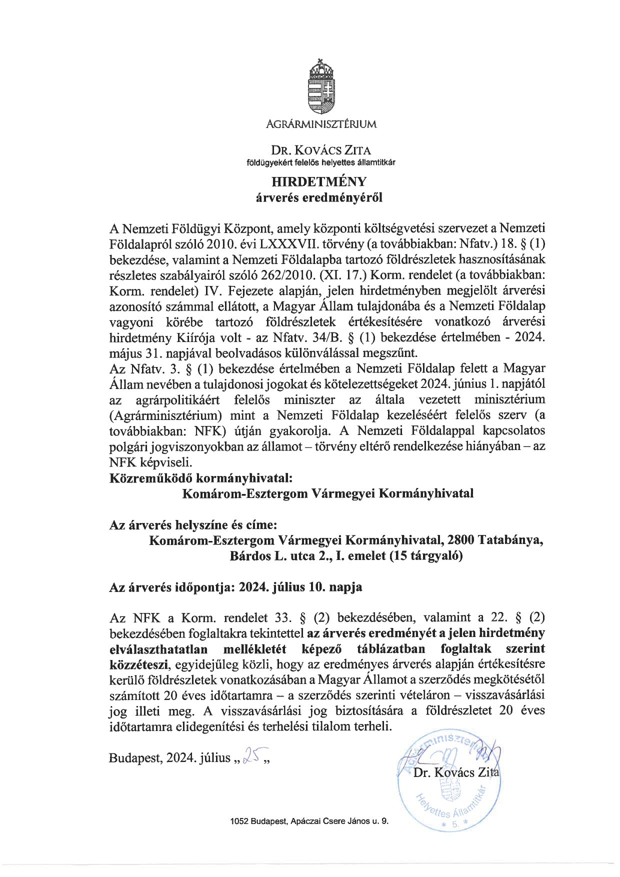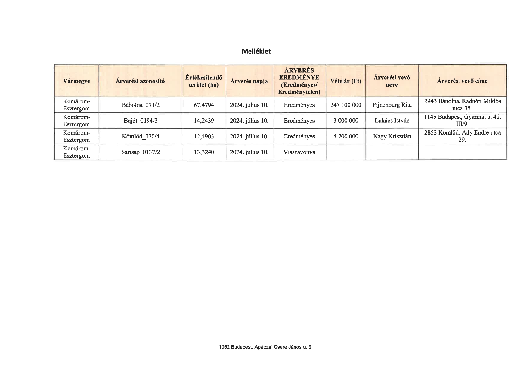 Hirdetmény árverés eredményéről